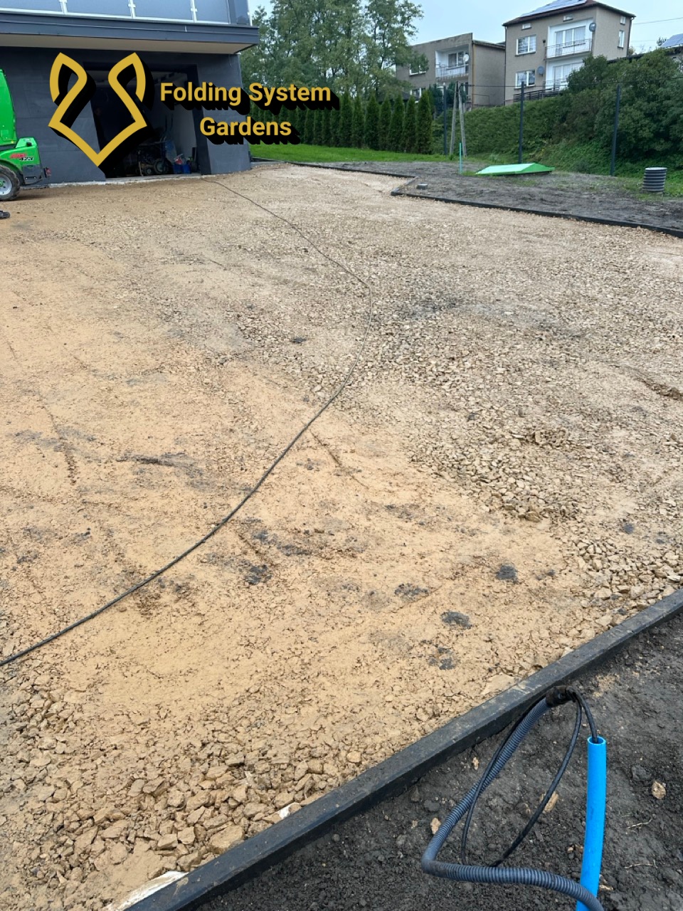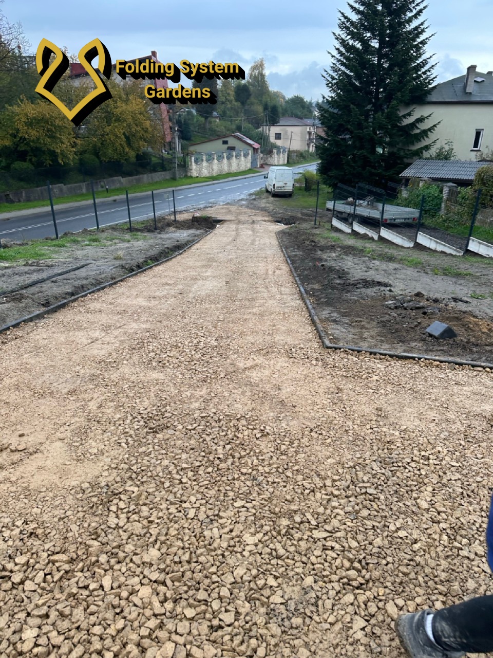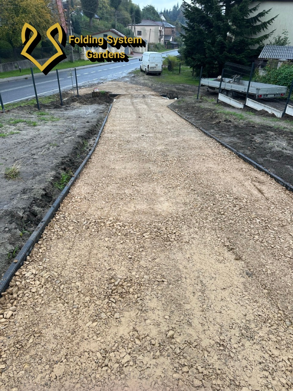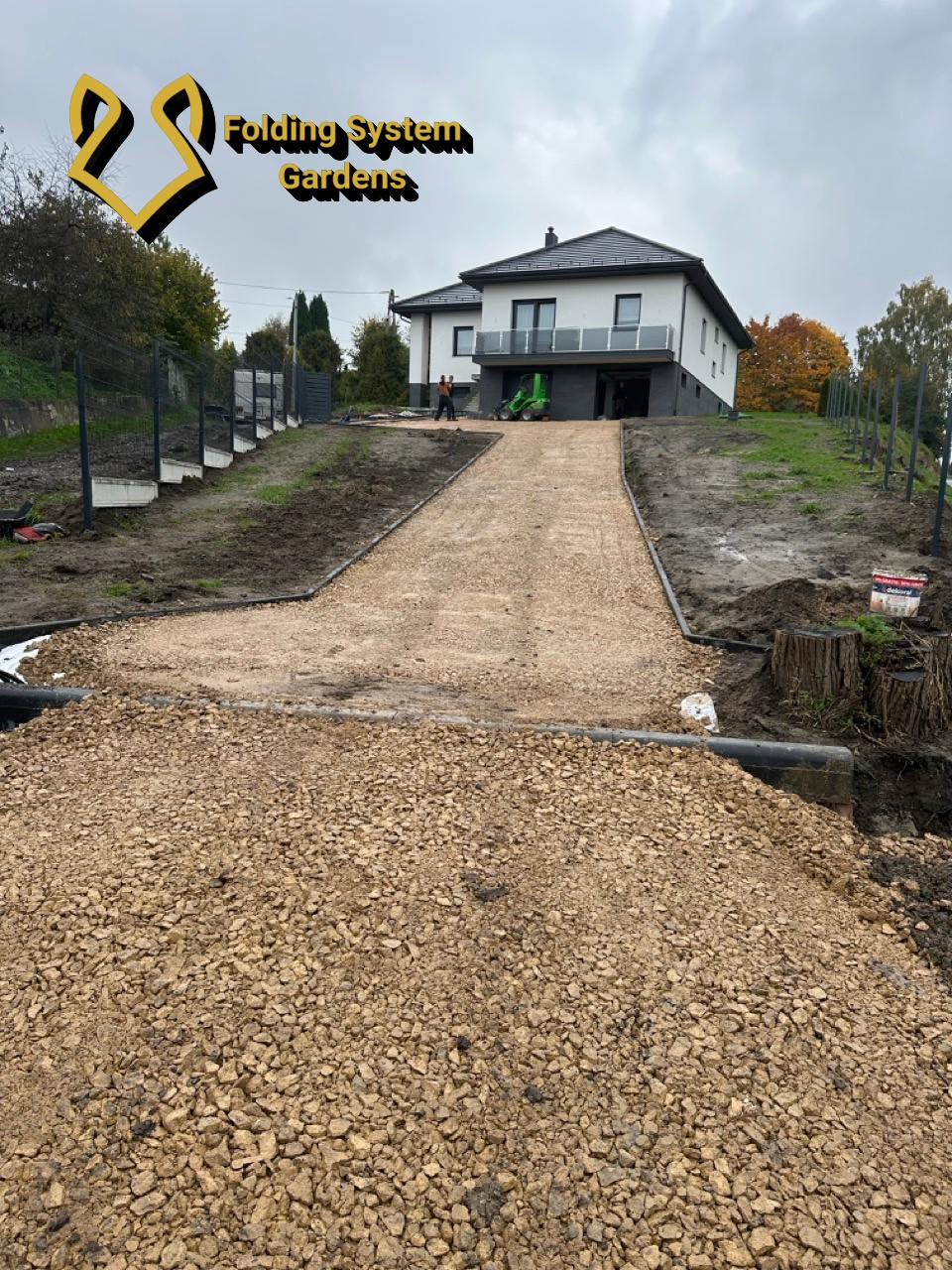 Stworzenie funkcjonalnego, estetycznego podjazdu oraz chodnika bocznego do domu — z myślą o trwałości, odpowiednim odprowadzeniu wody oraz możliwości rozbudowy w przyszłości. Podjazd wykonany ze żwiru ozdobnego jako docelowe lub tymczasowe rozwiązanie, z podbudową przygotowaną pod ewentualną przyszłą kostkę brukową.