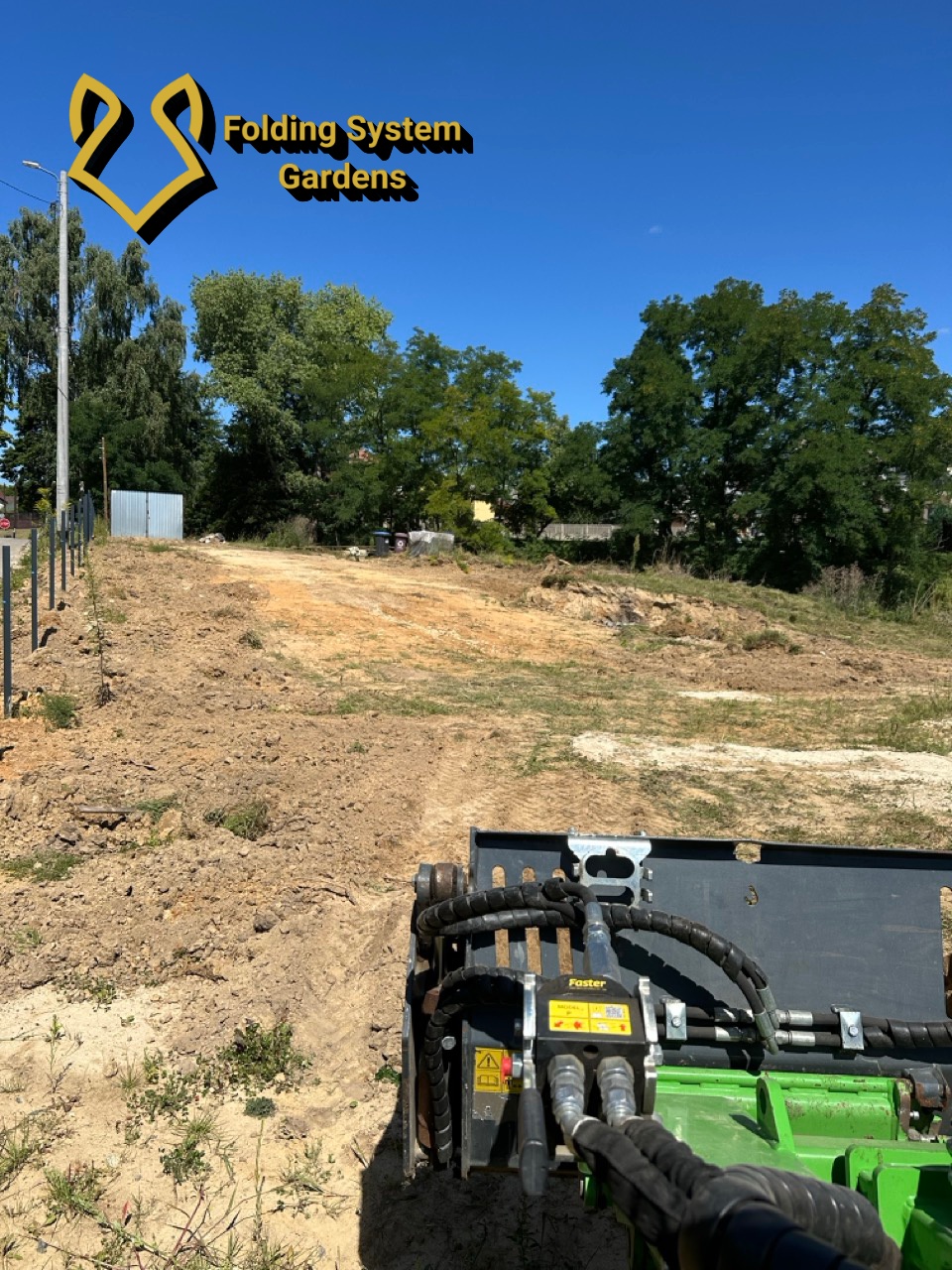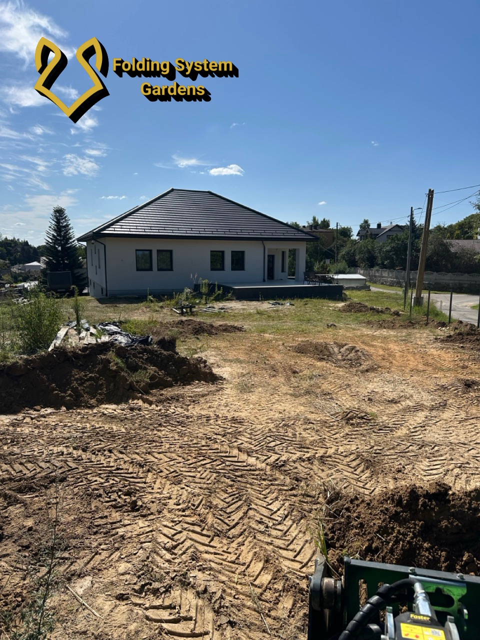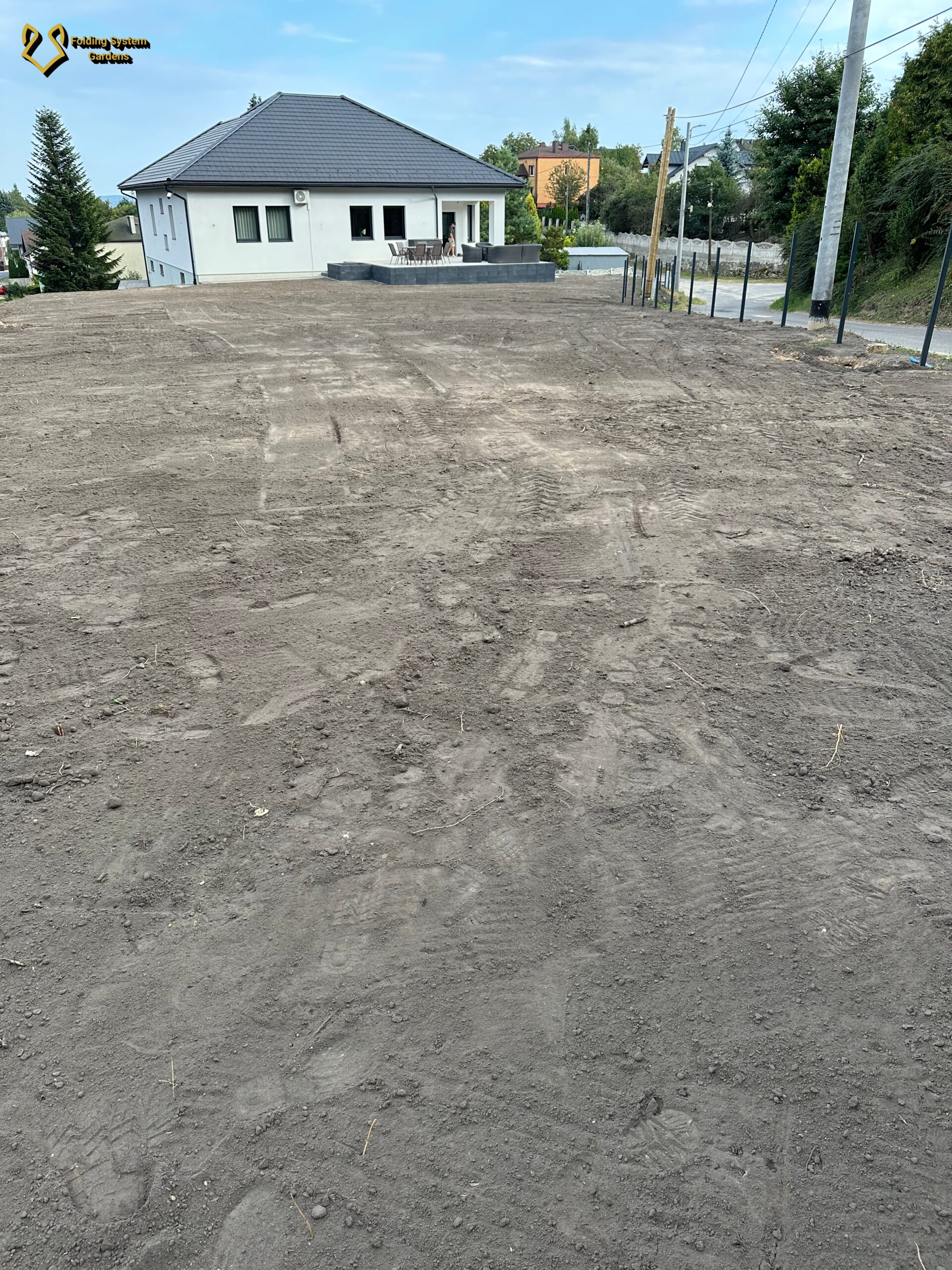 Przygotowanie całkowicie zdegradowanego terenu pod budowę ogrodu — oczyszczenie z gruzu, kamienia, wstępne wyrównanie oraz uzupełnienie ziemi do poziomu umożliwiającego dalsze prace. Kluczowym założeniem było opanowanie trudnych spadków terenu tak, by woda nie spływała niekontrolowanie i nie tworzyła rozlewisk oraz błota.