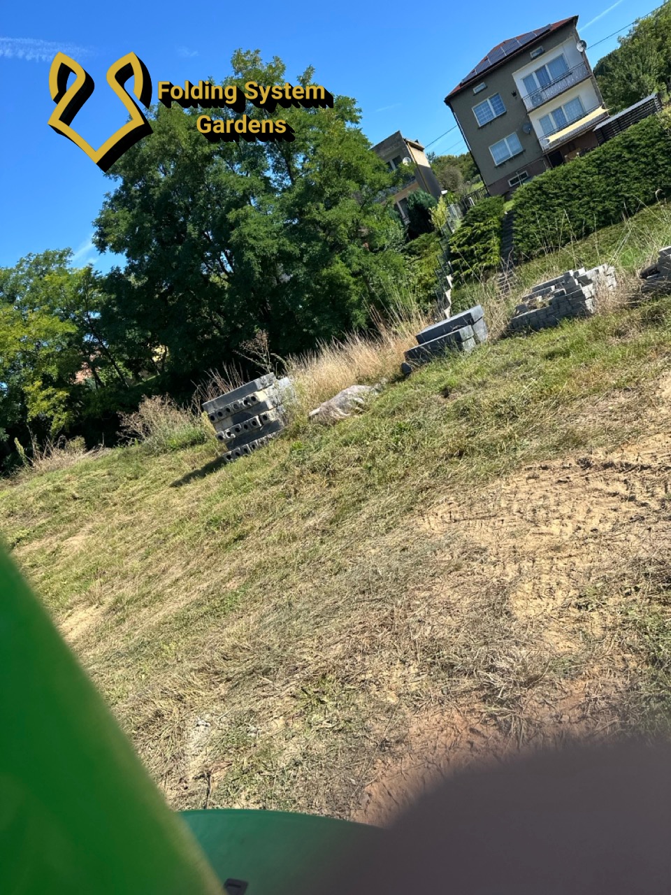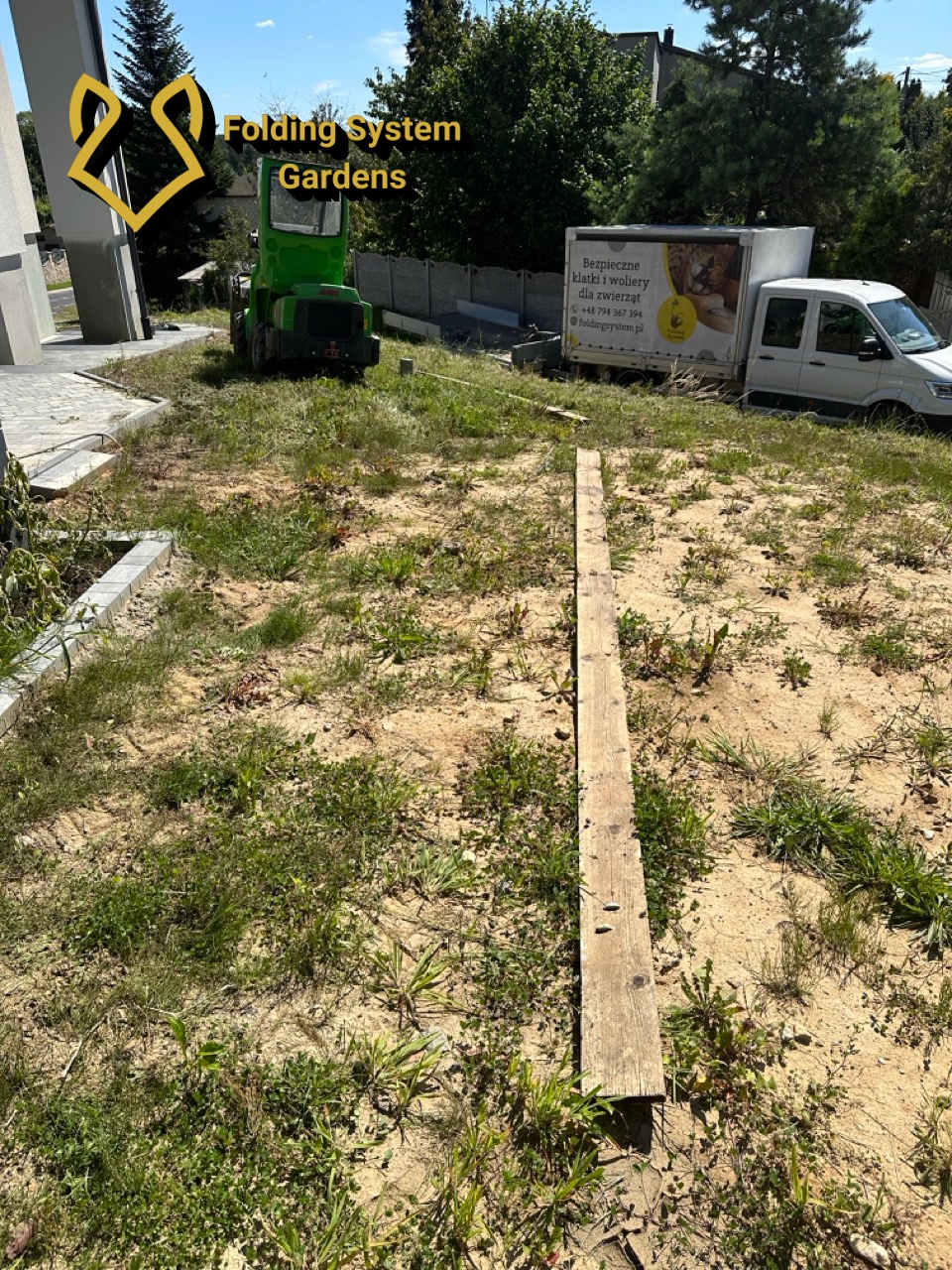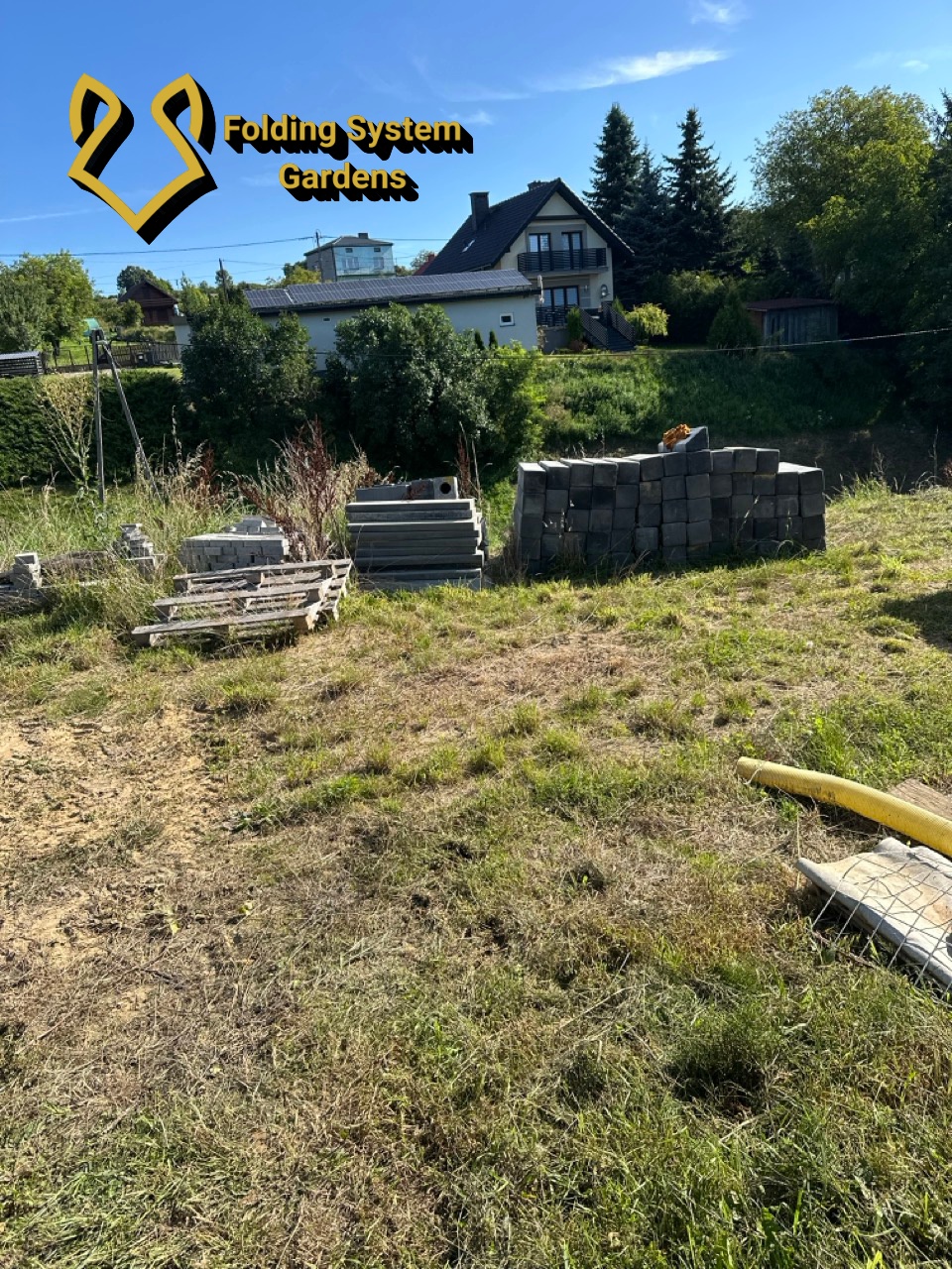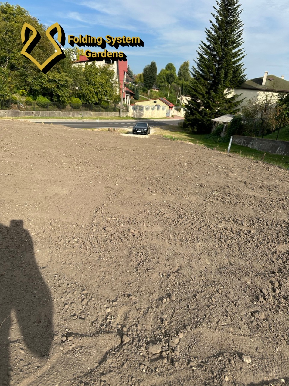Przygotowanie całkowicie zdegradowanego terenu pod budowę ogrodu — oczyszczenie z gruzu, kamienia, wstępne wyrównanie oraz uzupełnienie ziemi do poziomu umożliwiającego dalsze prace. Kluczowym założeniem było opanowanie trudnych spadków terenu tak, by woda nie spływała niekontrolowanie i nie tworzyła rozlewisk oraz błota.