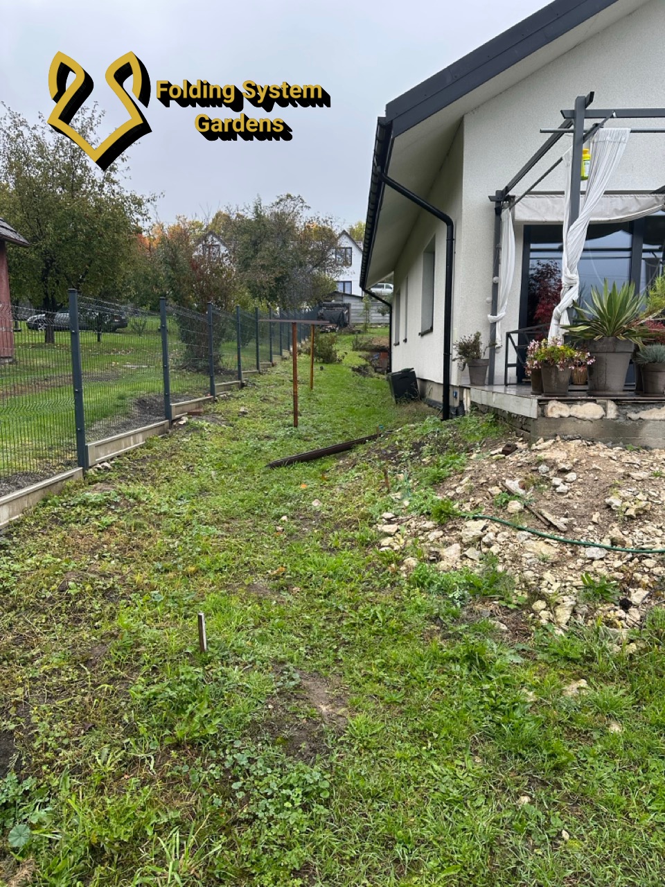 Działka od początku stawiała opór — nierówna powierzchnia wymagała nie tylko prostego wyrównania, ale przemyślanego kształtowania spadków w różnych kierunkach. Teren musiał być ukształtowany tak, by jednocześnie odprowadzać wodę we właściwych kierunkach i wyglądać naturalnie oraz estetycznie. To nie jest praca którą robi się na oko — zły spadek w złym miejscu oznacza błoto, podmakanie fundamentów lub stojącą wodę, której nie da się potem łatwo naprawić bez rozkopywania gotowego ogrodu.